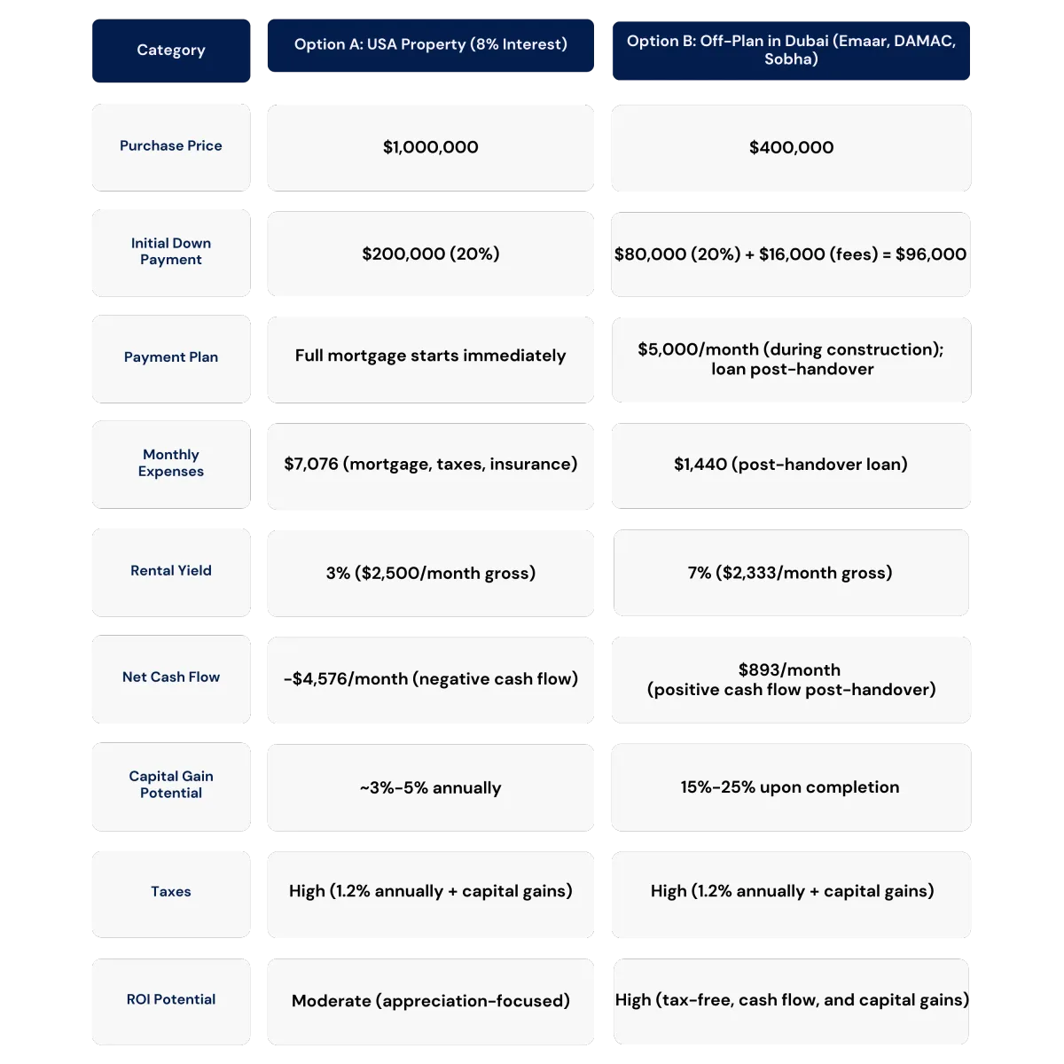 Lower Initial Costs: Dubai’s $400,000 starting price and affordable payment plans make it accessible to more investors.